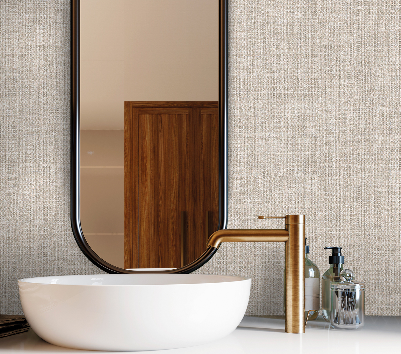 PAPEL PINTADO VINÍLICO TEXTURIZADO RAFFIA GRUESA. CESTERIA BEIGE CLARO, ORO SUAVE