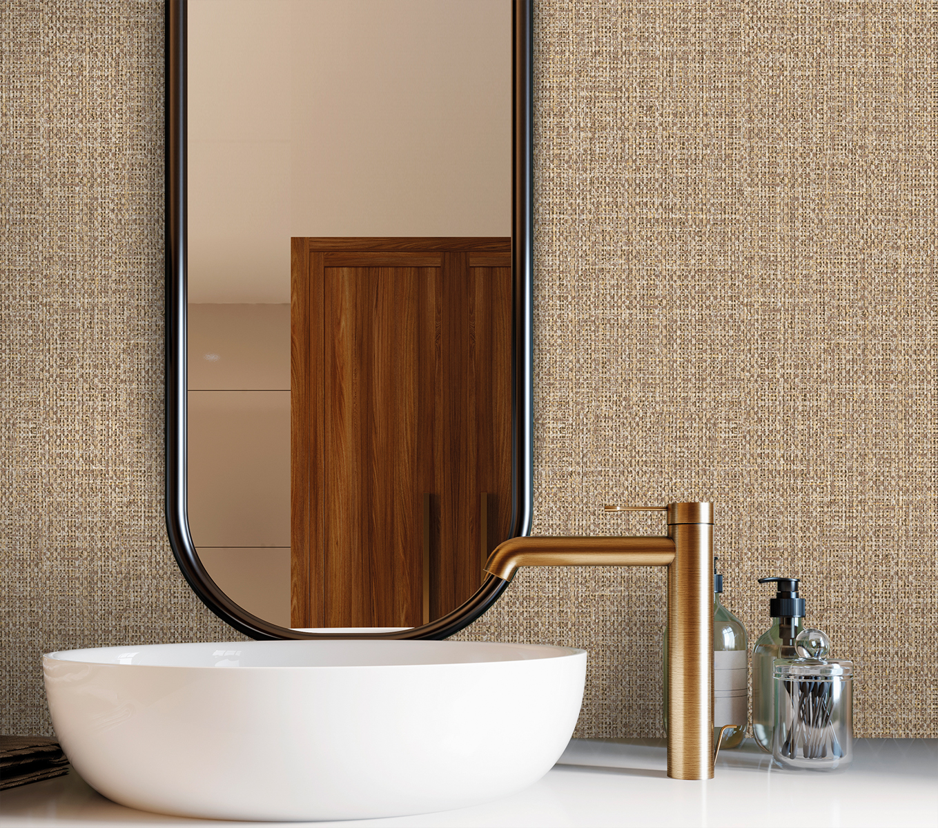 PAPEL PINTADO VINÍLICO TEXTURIZADO RAFFIA GRUESA. CESTERIA BEIGE, ORO SUAVE