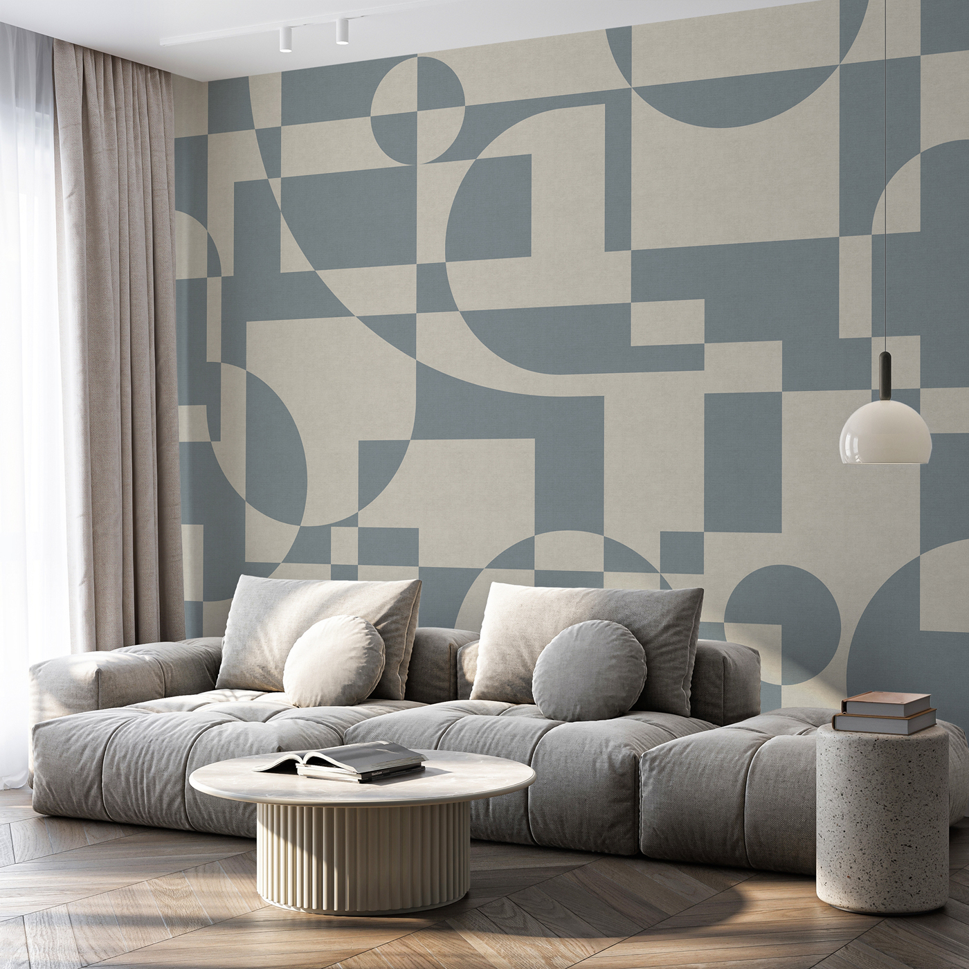 TETRIS AZUL, BEIGE. PAPEL PINTADO MURAL QUE SIMULA UN TAPIZ CON DISEÑO GEOMÉTRICO