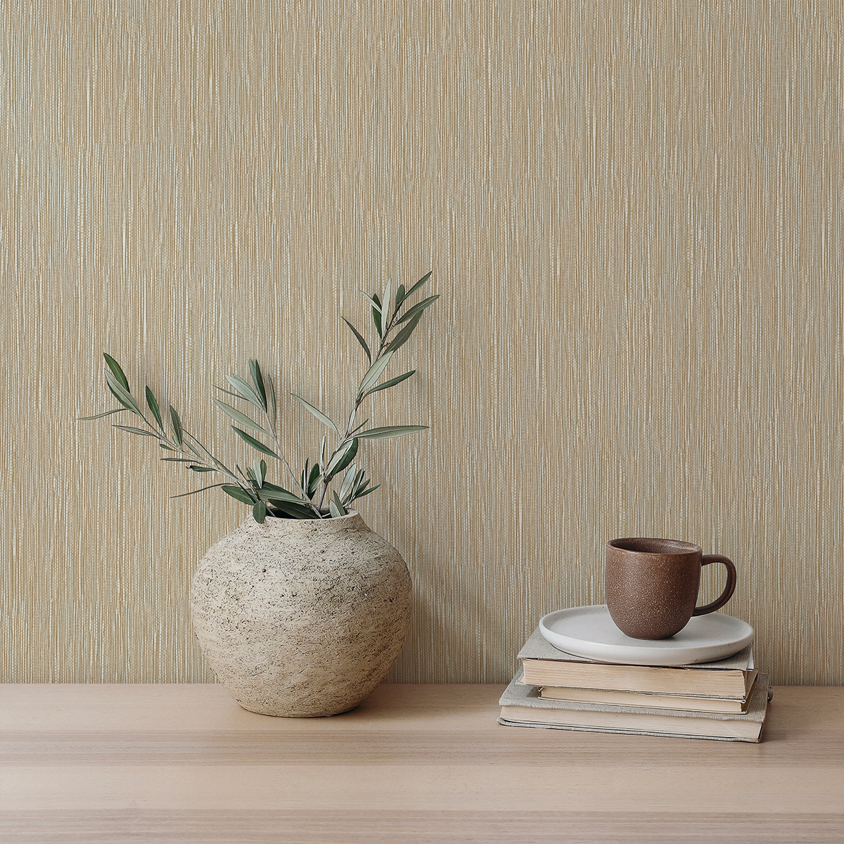PAPEL PINTADO VINÍLICO TEXTURIZADO RAFFIA FINA. RAFFIA BEIGE, NÁCAR Y ORO SUAVE