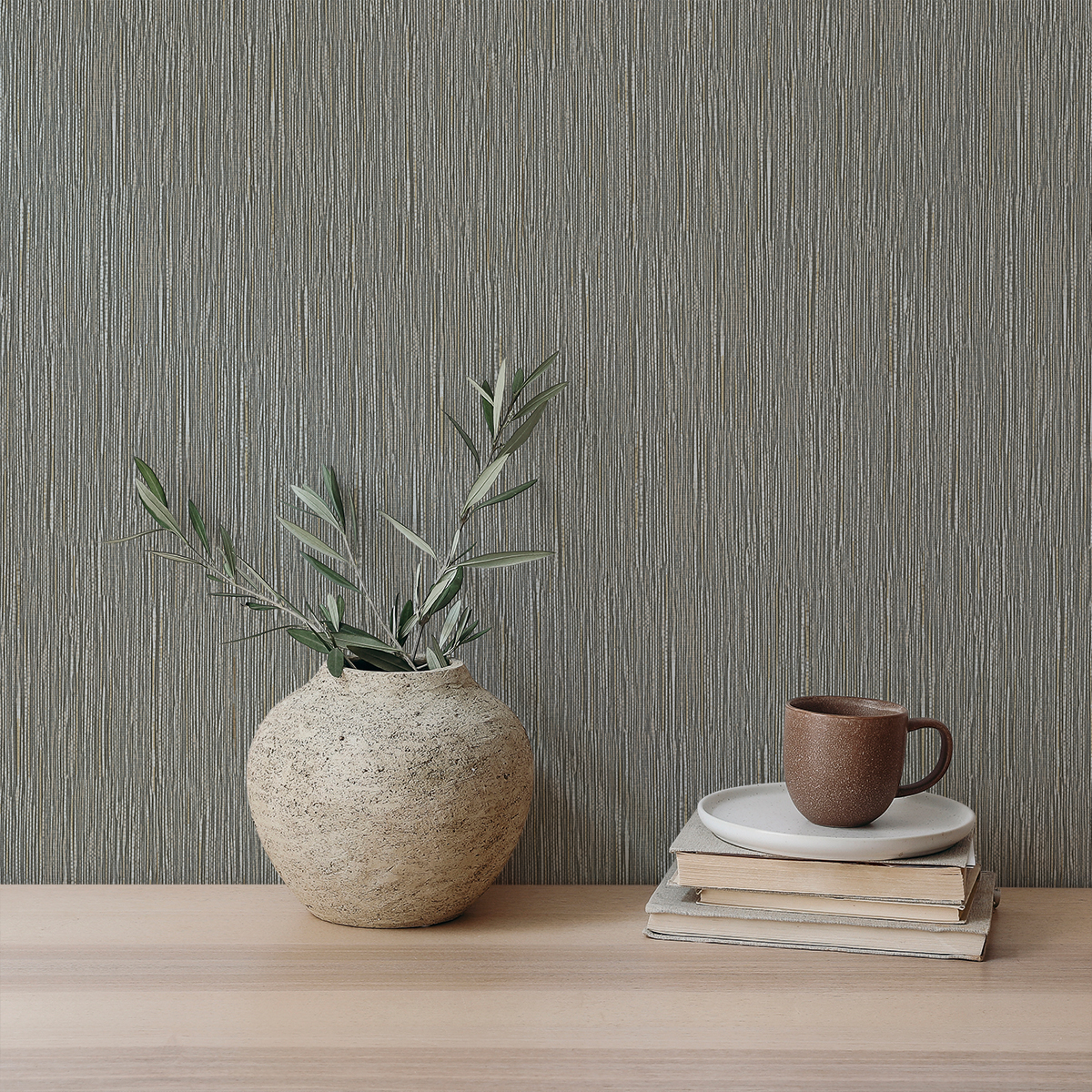 PAPEL PINTADO VINÍLICO TEXTURIZADO RAFFIA FINA. RAFFIA GRIS AZULADO, ORO